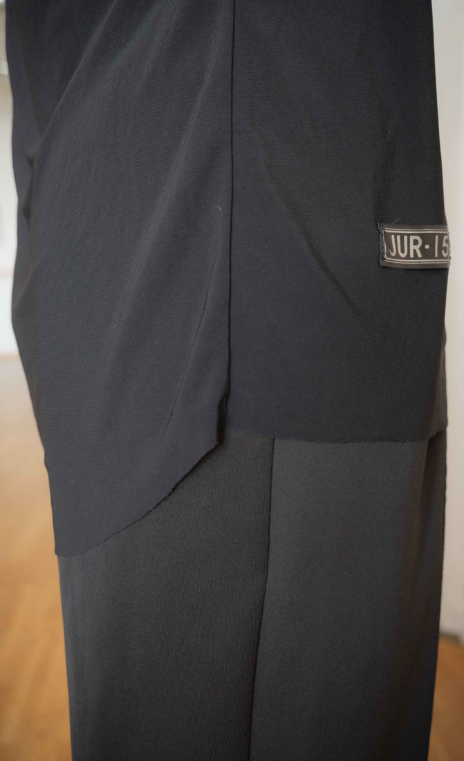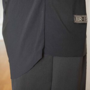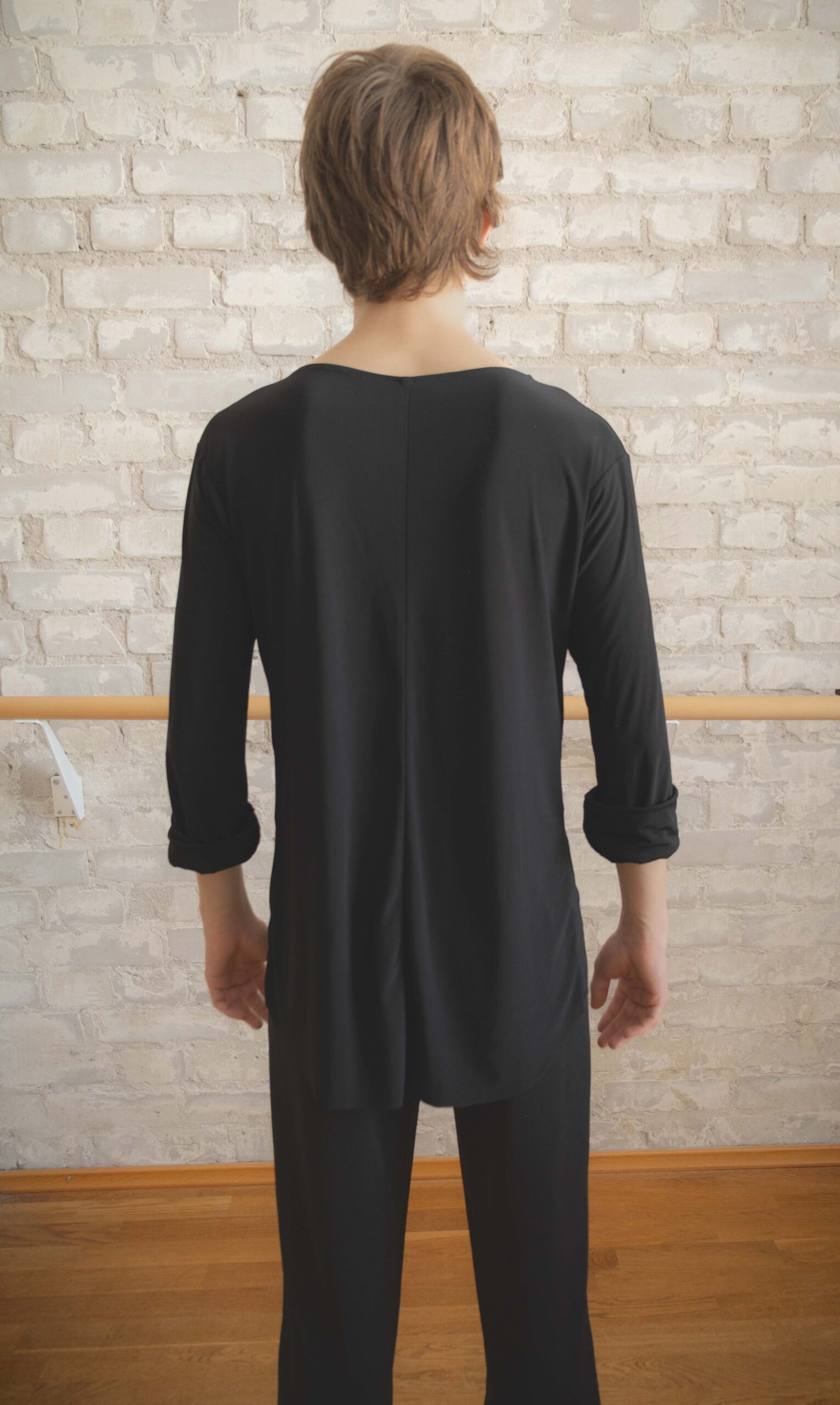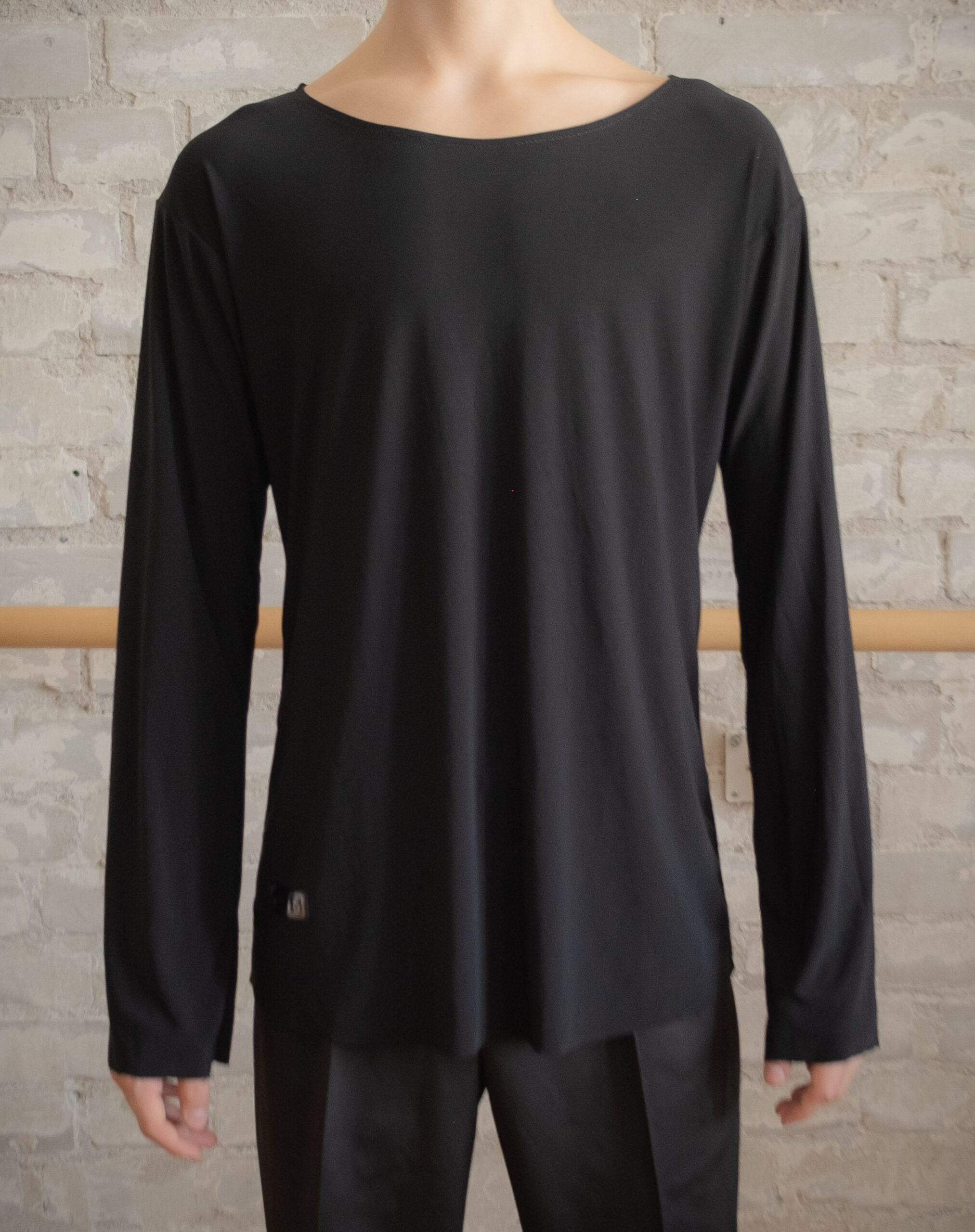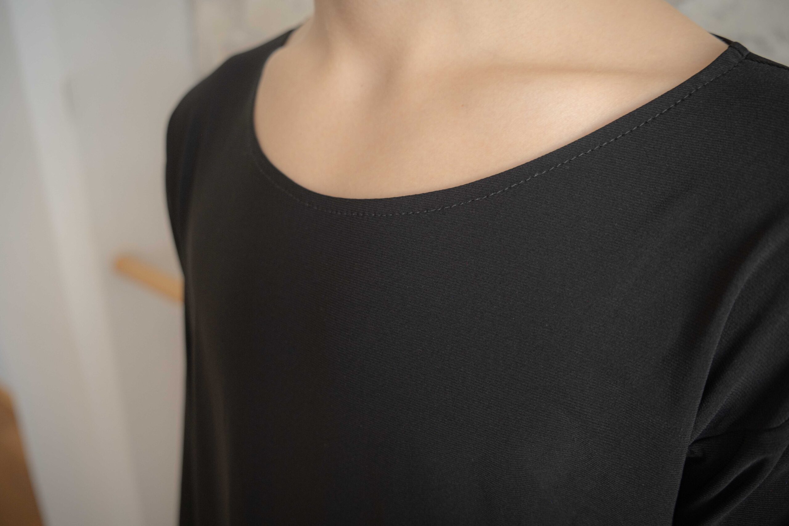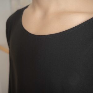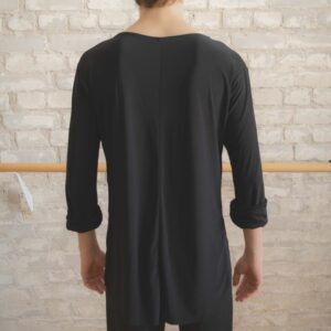 Musta pitkähihainen treenipaita U-mallisella kaula-aukolla kevyestä joustavasta crepe-kankaasta. Takaa vähän pidempi kuin edestä. Koot S, M ja L. Tilauksella saa myös muita kokoja.