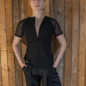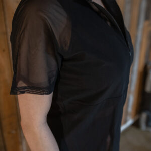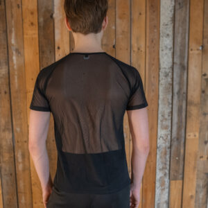 Musta T-paita vetoketjulla mesh-kankaasta. Koot XS, S, M ja L. Tilauksella saa myös muita kokoja.